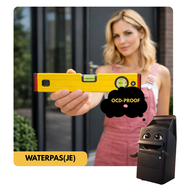 Wat zit er in de PakketBuddy doos? Alles wat je nodig hebt om je PakketBuddy direct te plaatsen zit standaard in de doos PakketBuddy EasyDrop™ (volledig gemonteerd) Bevestigingsmateriaal (bouten & pluggen) Montagehandleiding (duidelijk & stap-voor-stap) Montagevideo (QR-code naar video)